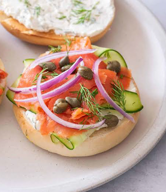 A bagel sandwich features a chewy bagel filled with meats, cheese, veggies, or cream cheese.